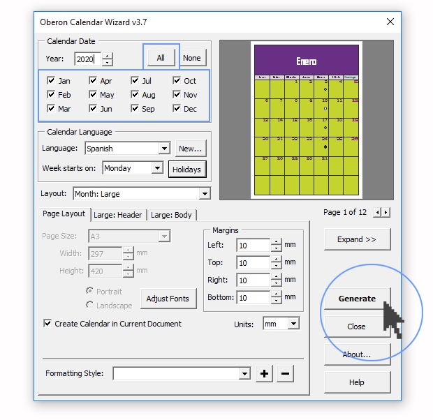 10º Una vez que haya personalizado por completo el formato de su calendario, sólo tiene que hacer clic en el botón GENERATE para que su calendario se cree automáticamente en CorelDRAW. Recuerde activar la casilla ALL si quiere incluir todos los meses del año en su nuevo calendario.