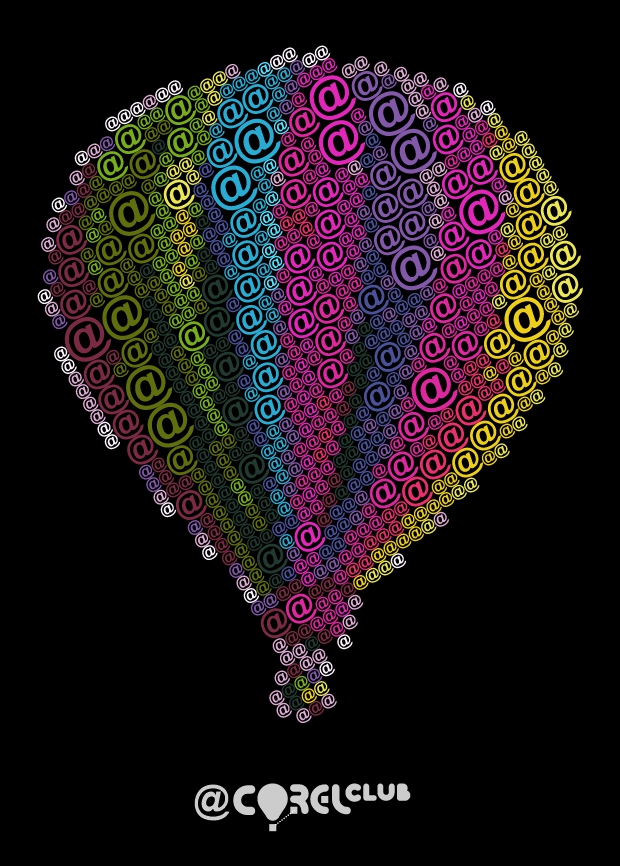 Esta imagen 100 % vectorial, que utilizamos como imagen promocional en las redes sociales del CORELCLUB.org , se creó íntegramente en CorelDRAW 2021, utilizando Pointillizer, con una forma personalizada (símbolo de la @), una Densidad de 5 y un valor de Fusionar adyacente de 10.