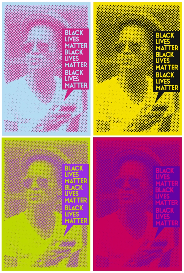 En la siguiente imagen puede ver un ejemplo de diseño de poster en donde se utilizó la misma trama de semitono generada con Pointillizer en varios colores sobre fondos de color en contraste.