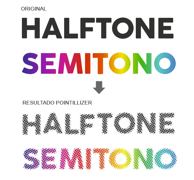 Ejemplo del resultado final tras aplicación del efecto Pointillizer a dos objetos de texto, uno con relleno de color negro y otro con relleno de degradado multicolor.