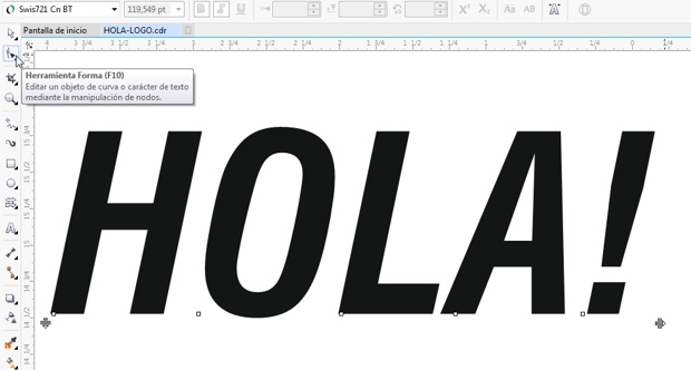 En primer lugar escriba con la herramienta Texto cualquier palabra en un documento nuevo de CorelDRAW. En el ejemplo se utilizó el texto HOLA en la tipografía Swiss721Cn BT en estilo cursiva. Con el nuevo objeto de texto seleccionado, haga clic en la herramienta FORMA de la caja de herramientas. Al seleccionar un objeto de texto con la herramienta Forma, al lado de cada caracter aparece un pequeño cuadrado o nodo, estos cuadrados permiten seleccionar cada caracter de forma individualizada, permitiendo aplicar un formato distinto para cada letra. Por ejemplo puede cambiar libremente el tamaño, el color, el estilo o la posición de cada letra por separado.